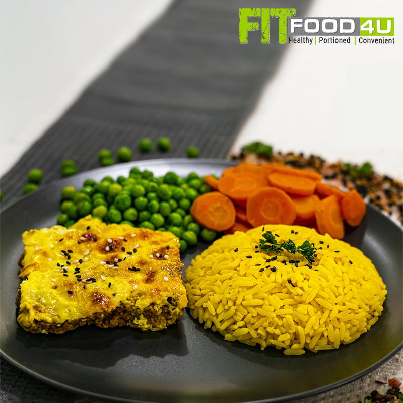 Beef Bobotie with Yellow Rice and Peas and Carrots