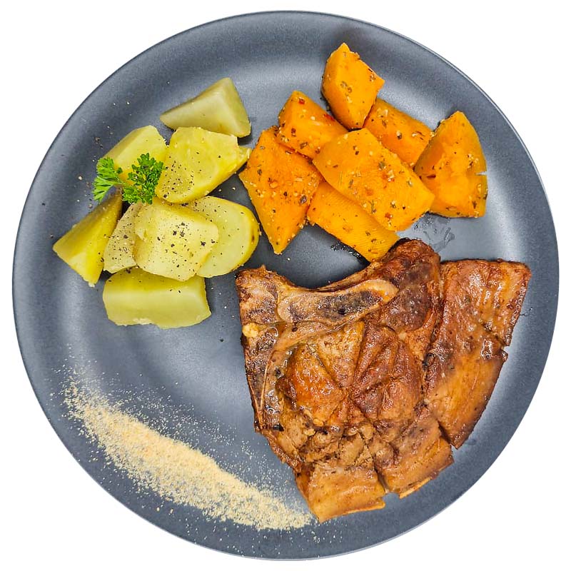 A well-sized pork chop, oven-baked to perfection with a generous side of cubed sweet potato and butternut to turn this meal into a healthy, yet comforting & delicious dinner option.